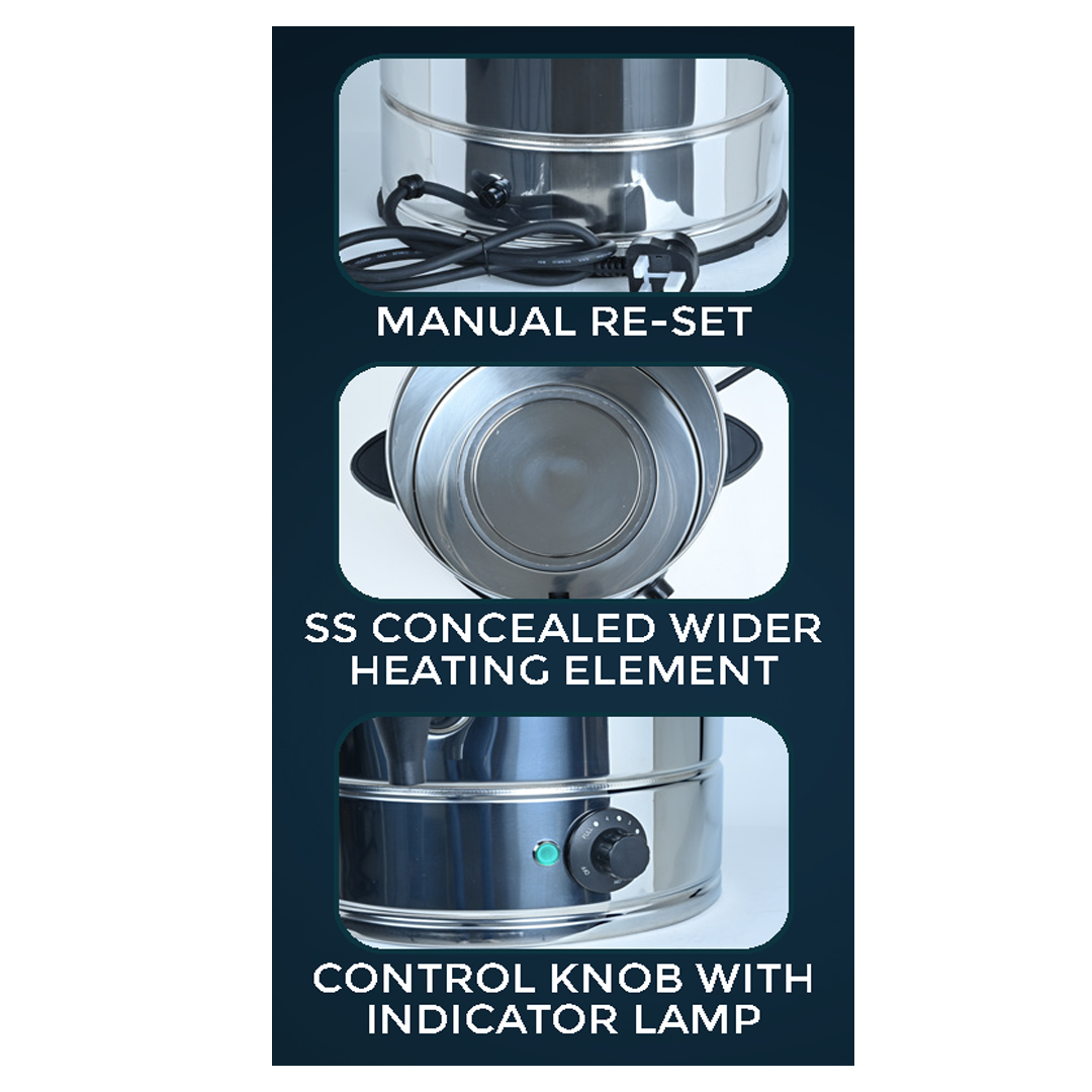 backerson commercial electric catering urn Integrated auto boil-auto cutoff-auto restart system   Capacity: 30L, 20L & 15L